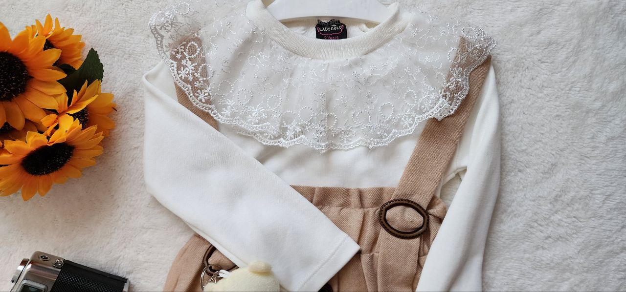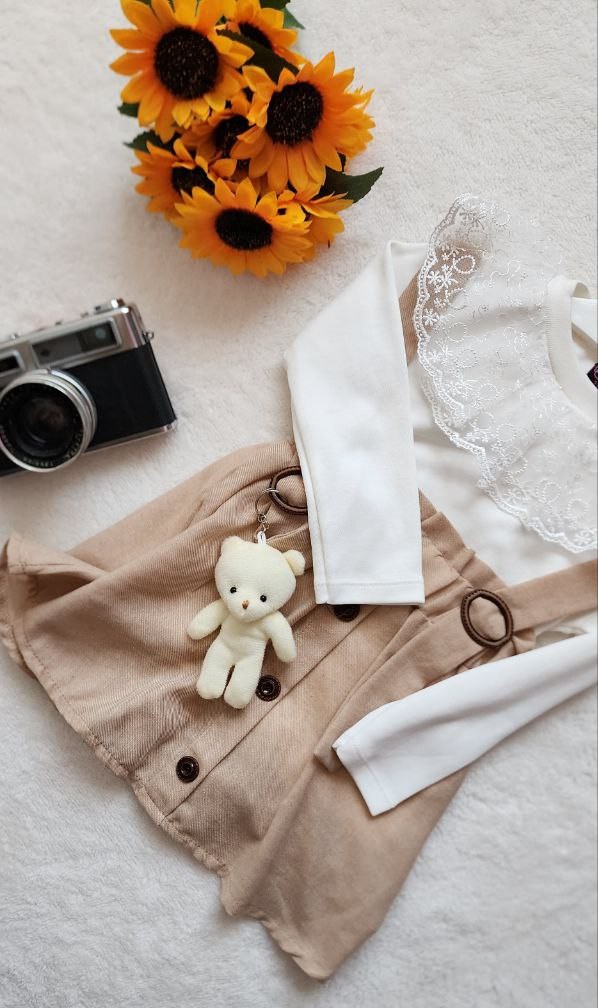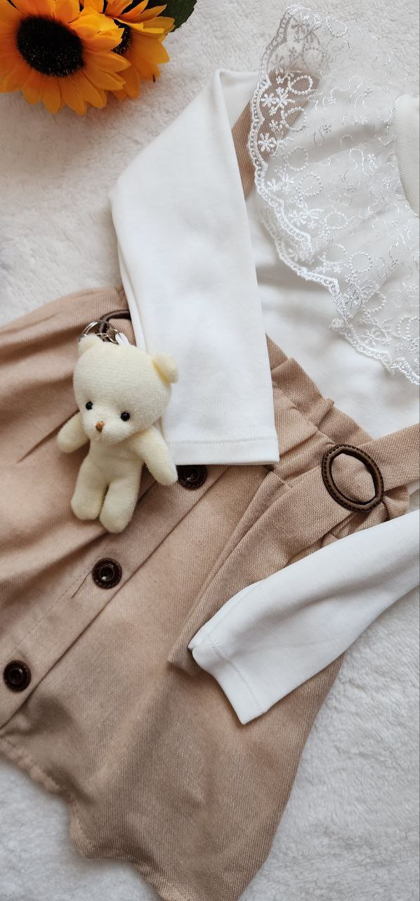 Minik prensesiniz için hem zarif hem de sevimli bir kombin arıyorsanız, bu özel tasarım tam size göre! Ekru uzun kollu dantel yakalı üst, tokalı bej askılı etekle şıklığı tamamlarken, peluş ayıcık aksesuar detayı bu takımı çocuk modasında farklı bir seviyeye taşıyor.