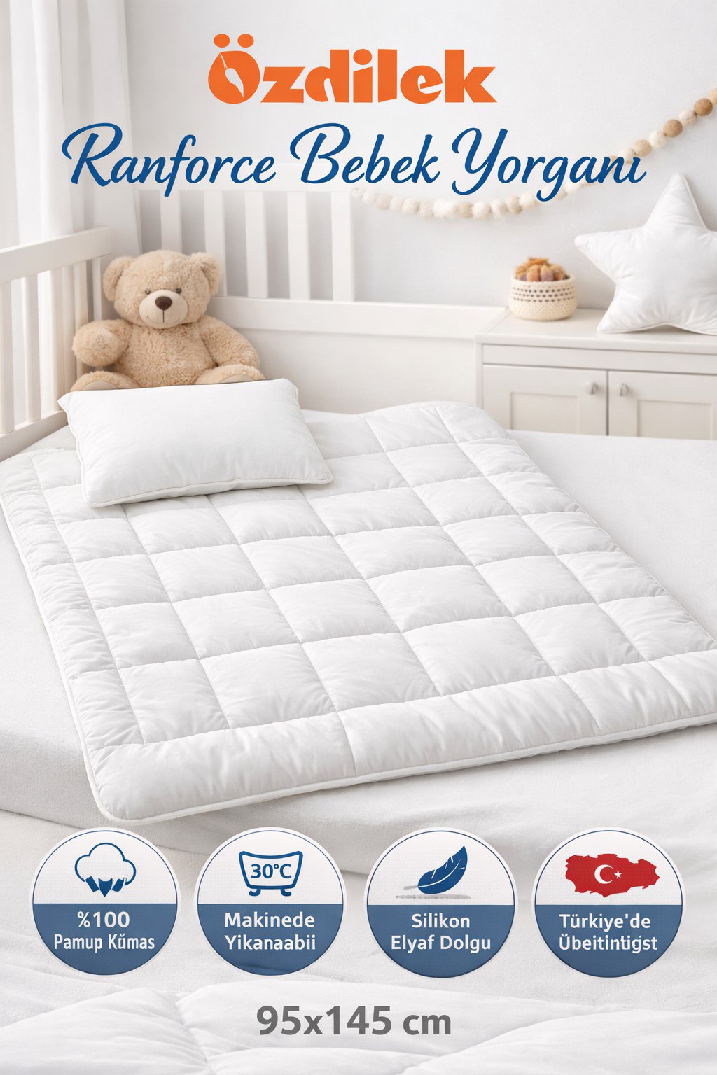 Özdilek Bebek Yorganı 95×145 cm ölçülerinde tasarlanmış, bebeğinizin hassas cildi için özel olarak üretilmiş kaliteli bir uyku tekstili ürünüdür. Üst yüzeyde %100 pamuk kumaş kullanılırken, iç dolgusu silikon elyaf sayesinde yumuşak, hafif ve terletmeyen bir uyku konforu sağlar. Yorganın nefes alabilir yapısı ile gece boyu rahat bir uyku ortamı sunar ve bebekler için ideal sıcaklık dengesi oluşturur. Ürün günlük kullanım için kolay temizlenebilir; yıkama sonrası yatay kurutulması önerilir. Ürün ayrıca Türkiye’de üretilmiştir.